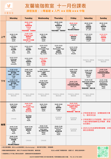 【課表更新時間】 詳細課程變動以17Fit約課系統為準,每月25日會開放次月課程預約。 【17FIT預約網站】 預約網址 【新生體驗】 凡第一次至友馨上課,即享有