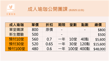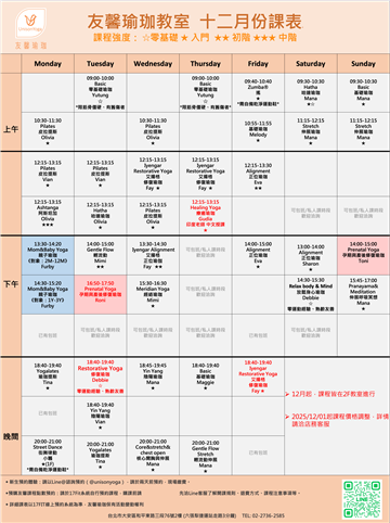 【課表更新時間】 詳細課程變動以17Fit約課系統為準,每月25日會開放次月課程預約。 【17FIT預約網站】 預約網址 【新生體驗】 凡第一次至友馨上課,即享有