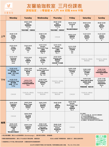 【課表更新時間】 詳細課程變動以17Fit約課系統為準,每月25日會開放次月課程預約。 【17FIT預約網站】 預約網址 【新生體驗】 凡第一次至友馨上課,即享有